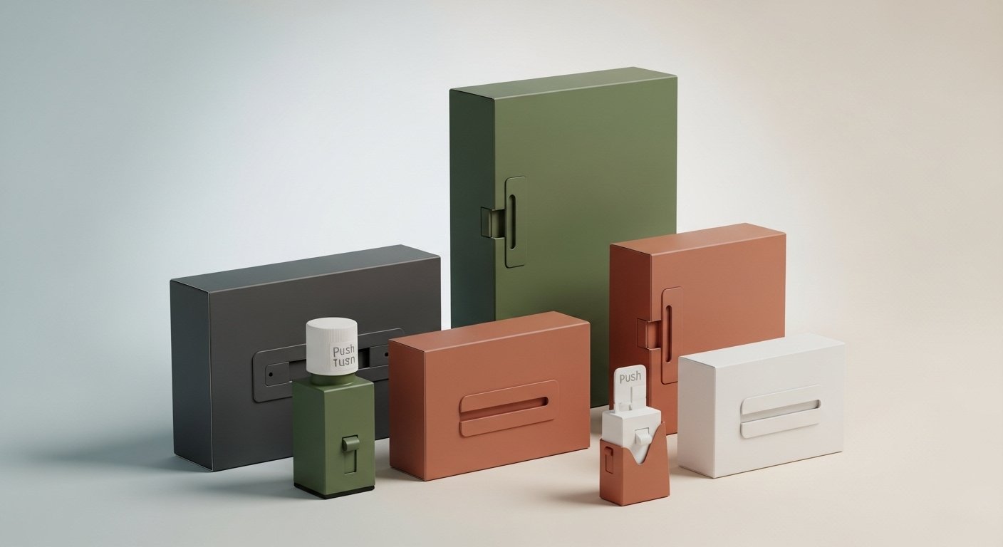 Push-Down-and-Turn Caps: Common in pharmaceuticals, requiring strength to open.